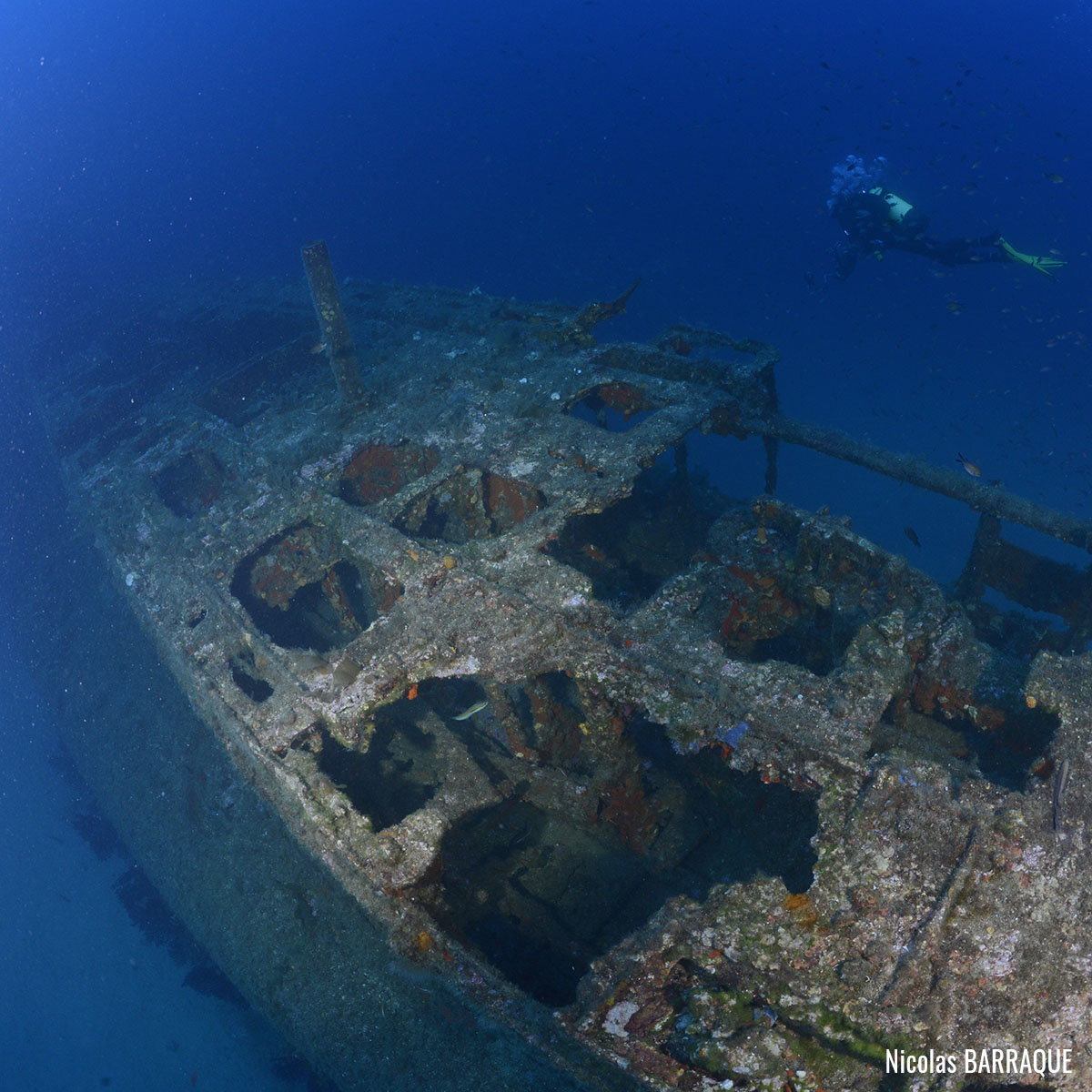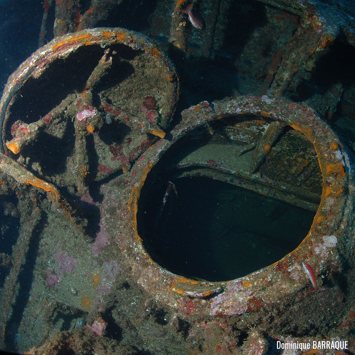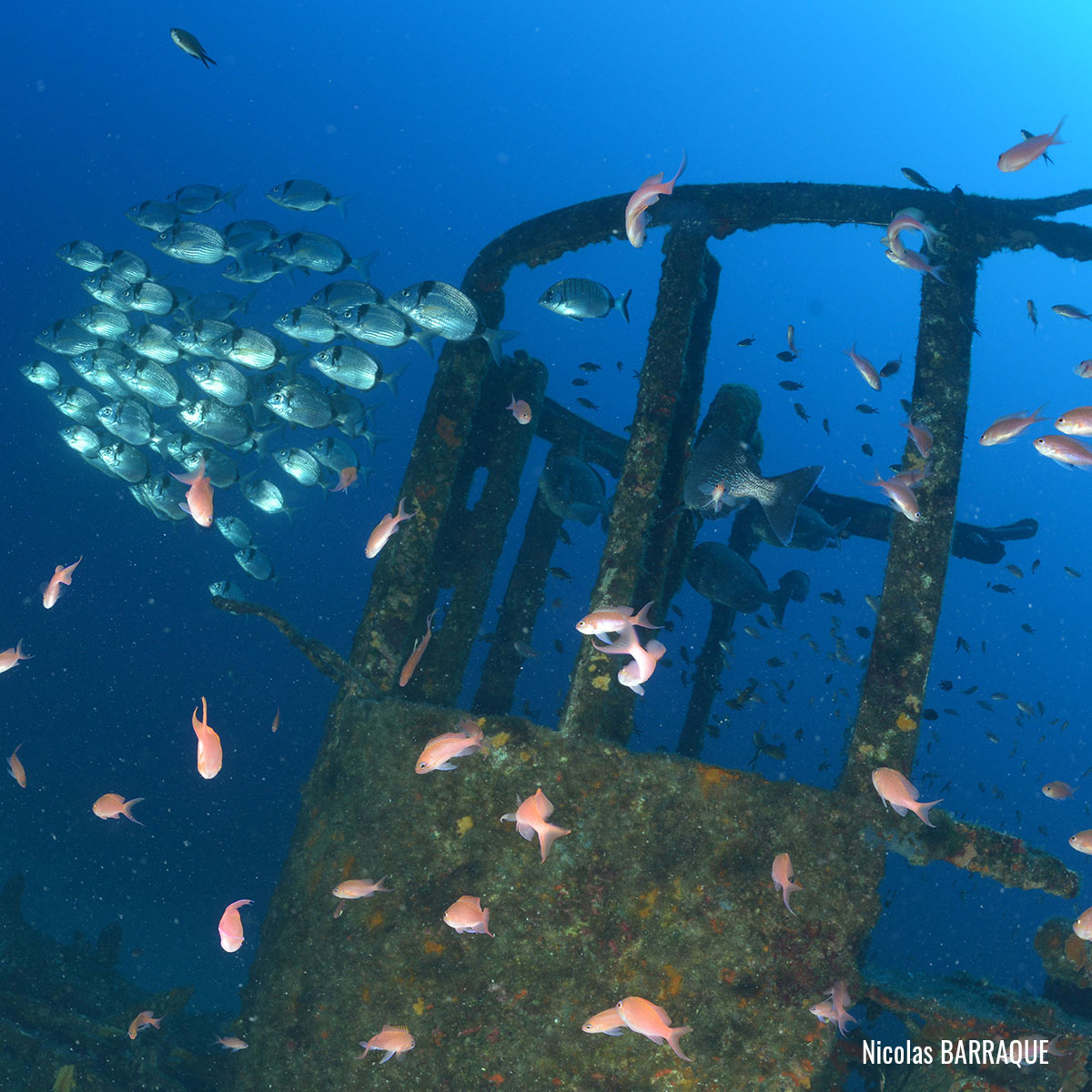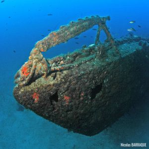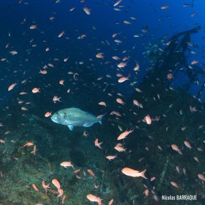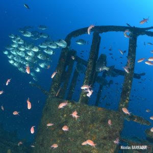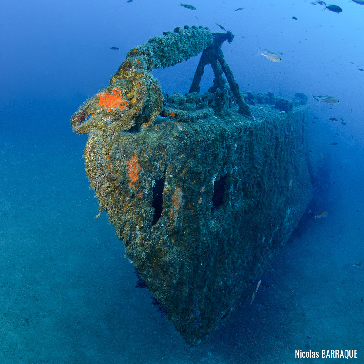 The wreck is positioned vertically on a sandy seabed, with some red sea fans (Paramuricea clavata) attached to the starboard bow and extremely rich fauna: grouper (Epinephelus marginatus), moray eels (Muraena helena), common two-banded sea bream (Diplodus vulgaris), school of swallowtail sea perch (Anthias anthias), etc.